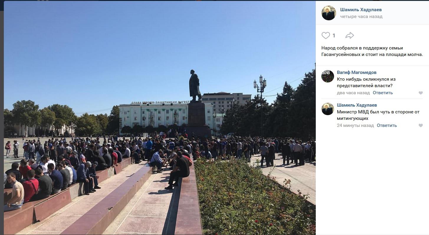 "Народ собрался в поддержку семьи Гасангусейновых и стоит на площади молча", - отметил в аккаунте во "ВКонтакте" Шамиль Хадулаев, опубликовав фото площади, заполненной людьми.