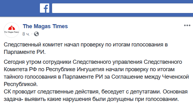 О начале проверки заявления депутатов сообщил сегодня днем еще один источник. "СК проводит следственные действия, беседует с депутатами. Основная задача - выявить какие нарушения были допущены при голосовании", - говорится в публикации сообщества The Magas Times.
