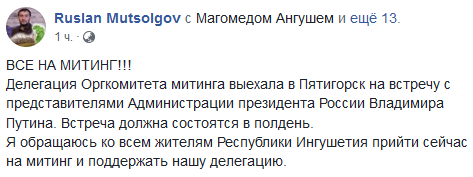 "Я обращаюсь ко всем жителям Республики Ингушетия прийти сейчас на митинг и поддержать нашу делегацию", - написал он на своей странице в Facebook.