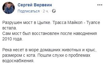 "Трасса Майкоп - Туапсе встала. Мост был восстановлен после наводнения 2010 года. Река несет в море домашних животных и крыс размером с кота", - написал Вервеин на своей странице в Facebook.