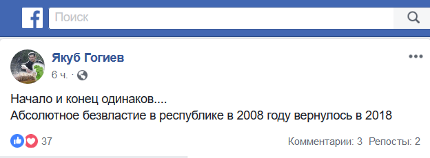 "Начало и конец одинаков. Абсолютное безвластие в республике в 2008 году вернулось в 2018. Я про то, как "открыта" Ингушетия для всех залетных групп", - написал ингушский активист, историк Якуб Гогиев на своей странице в Facebook. "Проходной двор, а не республика", - написал в ответ Увайс Мамилов.