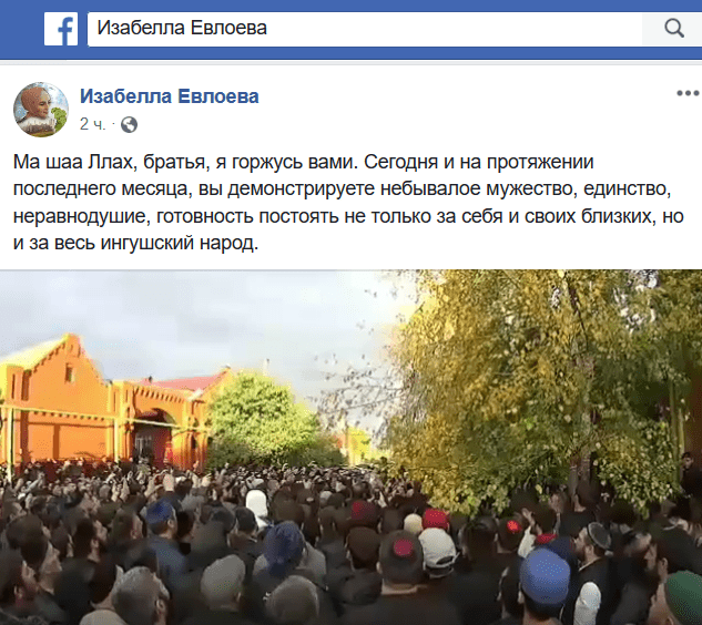 Аналогичными наблюдениями поделились и другие ингушские активисты. "Братья, я горжусь вами. Сегодня и на протяжении последнего месяца вы демонстрируете небывалое мужество, единство, неравнодушие, готовность постоять не только за себя и своих близких, но и за весь ингушский народ", - написала журналистка Изабелла Евлоева, комментируя видеозапись собрания у дома Погорова на своей странице в Facebook.