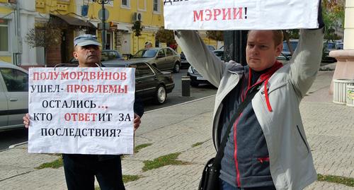 Активисты собрались у знака "Нулевой километр" в центре Астрахани на групповой пикет 30 октября с плакатами: "Требуем усилить общественный контроль за деятельностью мэрии" и "Полумордвинов (экс-глава администрации Астрахани. - Прим. "Кавказского узла") ушел – проблемы остались. Кто ответит за последствия?", передает корреспондент "Кавказского узла".
