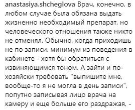 "Врач, конечно, в любом случае была обязана выдать жизненно необходимый препарат, но человеческого отношения также никто не отменял. Обычно, когда приходишь не по записи, минимум из поведения в кабинете - хотя бы обратиться с извиняющимся тоном", - высказала свое мнение anastasiya.shcheglova.