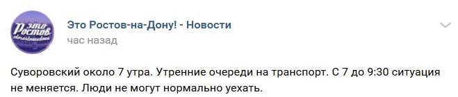 "Суворовский около 7 утра. Утренние очереди на транспорт. С 7 до 9:30 ситуация не меняется. Люди не могут нормально уехать", - отмечается в сообщении, опубликованном сегодня в группе "Это Ростов-на-Дону" в соцсети "ВКонтакте".