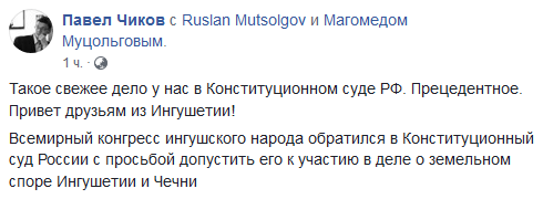 Всемирный конгресс ингушского народа обратился в Конституционный суд России с просьбой допустить его к участию в деле о земельном споре Ингушетии и Чечни, написал сегодня на своей странице в Facebook руководитель Международной правозащитной группы "Агора" Павел Чиков.
