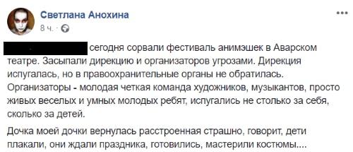"Сегодня сорвали фестиваль анимэшек в Аварском театре. Засыпали дирекцию и организаторов угрозами. Дирекция испугалась, но в правоохранительные органы не обратилась. Организатор - молодая четкая команда художников, музыкантов, просто живых веселых и умных молодых ребят, испугалась не столько за себя, сколько за детей", - написала дагестанская журналистка Светлана Анохина на своей странице в социальной сети Facebook.