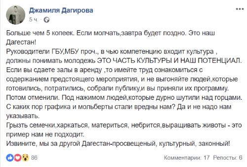 "Если молчать, завтра будет поздно. Это наш Дагестан! Руководители ГБУ (государственных бюджетных учреждений), МБУ (муниципальных бюджетных учреждений) и проч., в чью компетенцию входит культура, должны понимать молодежь. Это часть культуры и наш потенциал. Если вы сдаете залы в аренду, то имейте труд ознакомиться с содержанием предстоящего мероприятия, и не выгоняйте людей, которые готовились, потратились, собрали публику, и вы приняли их программу. Потом отменили", - прокомментировала срыв фестиваля куратор Первой галереи Джамиля Дагирова на своей странице в Instagram.