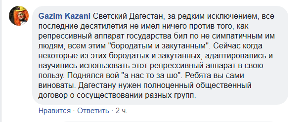 "Светский Дагестан, за редким исключением, все последние десятилетия не имел ничего против того, как репрессивный аппарат государства бил по несимпатичным им людям, всем этим "бородатым и закутанным". Сейчас, когда некоторые из этих бородатых и закутанных адаптировались и научились использовать этот репрессивный аппарат в свою пользу, поднялся вой "а нас то за шо". Ребята, вы сами виноваты. Дагестану нужен полноценный общественный договор о сосуществовании разных групп", - написал Gazim Kazani.
