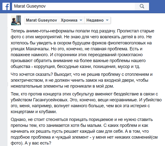 "Пролистал старые фото с этих мероприятий, не знаю для чего вовлекать детей в это. Не хотелось бы увидеть в скором будущем фриков фиолетовоголовых на улицах Махачкалы. Но это, конечно, не главная проблема. Есть и поважнее намного. И сторонники этих переодеваний громогласно призывают обратить внимание на более важные проблемы нашего общества - коррупция, бессудные казни, похищения, мусор и тд. [...] Тем, кто против концерта этих субкультур, вменяют бездействие в связи с убийством Гасангусейновых. Это, конечно, вещи несравнимые. И убийство это, меня, например, волнует намного больше, чем вся эта истерия с концертами и клубами. Однако, не стоит стесняться порицать порицаемое и не нужно ставить препоны тем, кто занимается хотя бы малым", - написал на своей странице в Facebook Марат Гусейнов.