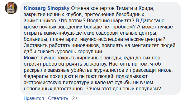 "Отмена концертов Тимати и Крида, закрытие ночных клубов, притеснения безобидных анимешников. Что потом? Введение шариата? В Дагестане кроме ночных заведений больше нет проблем? [...] Может лучше закрыть кирпичные заводы, куда до сих пор отвозят рабов батрачить за жратву? Настоять на том, чтоб раскрыли заказные убийства журналистов и правозащитников? Федералы похищают и пытают людей, подкидывают экстремистскую литературу и калечат судьбы ни в чем неповинных дагестанцев", - указал Kinosarg Sinopsky.