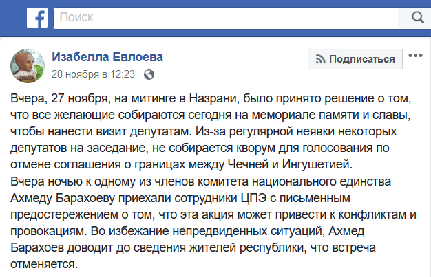 "Из-за регулярной неявки некоторых депутатов на заседание, не собирается кворум для голосования по отмене соглашения о границах между Чечней и Ингушетией. Ночью [28 ноября] к одному из членов комитета национального единства Ахмеду Барахоеву приехали сотрудники ЦПЭ с письменным предостережением о том, что эта акция может привести к конфликтам и провокациям. Во избежание непредвиденных ситуаций Ахмед Барахоев доводит до сведения жителей республики, что встреча отменяется", - написала Евлоева 28 ноября на своей странице в Facebook.