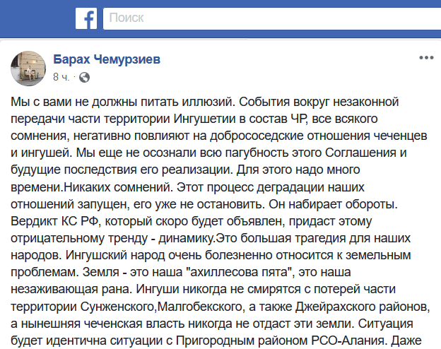 "События вокруг незаконной передачи части территории Ингушетии в состав ЧР, все всякого сомнения, негативно повлияют на добрососедские отношения чеченцев и ингушей. Мы еще не осознали всю пагубность этого Соглашения и будущие последствия его реализации. Этот процесс деградации наших отношений запущен, его уже не остановить. Он набирает обороты. Вердикт КС РФ, который скоро будет объявлен, придаст этому отрицательному тренду динамику. Это большая трагедия для наших народов", - написал активист в Facebook.
