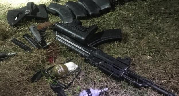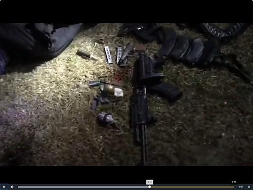На этом видео видно, что на земле лежит без движения мужчина в джинсах и черной куртке. Рядом с ним пятно крови, автомат и боеприпасы. Все это видно при свете фонарика, которым светят в темноте.