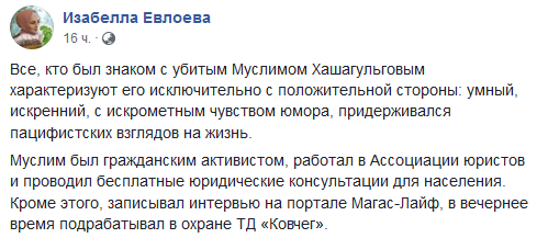 Все, кто лично знал Муслима Хашагульгова, характеризуют его только с положительной стороны, написала на своей странице в Facebook журналистка Изабелла Евлоева. "Умный, искренний, с искрометным чувством юмора, придерживался пацифистских взглядов на жизнь. Муслим был гражданским активистом, работал в Ассоциации юристов и проводил бесплатные юридические консультации для населения. Кроме этого, записывал интервью на портале "Магас-Лайф", в вечернее время подрабатывал в охране ТД "Ковчег", - написала она.