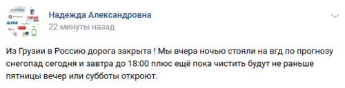 "Из Грузии в Россию дорога закрыта! Мы вчера ночью стояли на ВГД, по прогнозу снегопад сегодня и завтра до 18:00 плюс ещё пока чистить будут, не раньше пятницы вечер или субботы откроют", - написал сегодня пользователь соцсети "ВКонтакте" под ником Надежда Александровна на странице паблика "Ситуация на КПП Верхний Ларс (Крестовый перевал)".