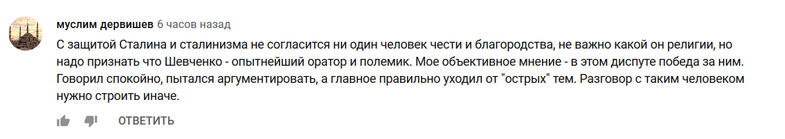 Тумсо Абдурахманов в заочном диспуте выглядит более убедительным, отметили пользователи YouTube. В ходе онлайн-дискуссии с блогером Джамбулат Умаров заявил о положительном восприятии рейда боевиков на Буденновск в конце первой чеченской кампании. Пользователи соцсетей сочли неприемлемыми такие высказывания из уст российского чиновника.