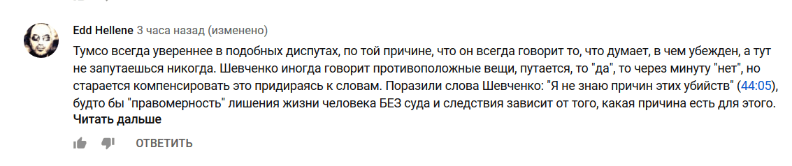 "Тумсо всегда увереннее в подобных диспутах, по той причине, что он всегда говорит то, что думает, в чем убежден, а тут не запутаешься никогда. Шевченко иногда говорит противоположные вещи, путается, то "да", то через минуту "нет"", - обратил внимание Edd Hellene.