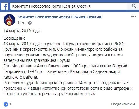 "13 марта 2019 года на участке Государственной границы РЮО с Грузией в окрестностях н.п. Орчосан Ленингорского района за нарушение режима государственной границы пограничниками задержаны два гражданина Грузии. Это Маргишвили Алан Симонович, 1983 г.р., Читишвили Георгий Георгиевич, 1997 г.р. – жители сел Карапила и Задиантакари Каспского района", - говорится в сообщении, размещенном на странице Комитета госбезопасности Южной Осетии в Facebook.