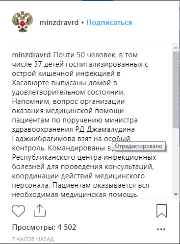"Почти 50 человек, в том числе 37 детей, госпитализированных с острой кишечной инфекцией в Хасавюрте, выписаны домой в удовлетворительном состоянии", - говорится в сообщении, опубликованном около 23.00 мск 25 марта в официальной группе Минздрава Дагестана в соцсети Instagram.
