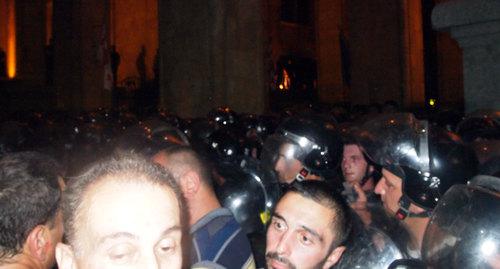 Со стороны Площади свободы к Парламенту двигалась колонна из нескольких пожарных автомобилей, вокруг которых сгруппировались спецназовцы. Подойдя к перекрестку Руставели и Перцеладзе, что между нацмузеем и кинотеатром, спецназовцы заняли оборону, прицелились в нас - я был в толпе из человек 15-20. Люди закричали: "Не стреляйте, не стреляйте!"