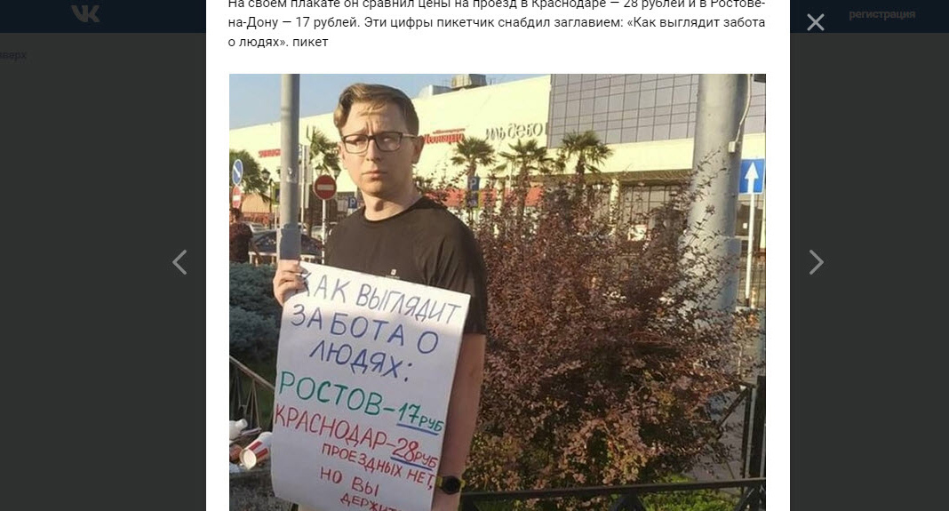 В Краснодаре сегодня местные жители провели одиночные пикеты. На улицу Ставропольскую вышел мужчина с плакатом, на котором было написано: "Нет повышению тарифов на проезд", сообщает издание "Новая Кубань". Вторая акция протеста прошла около торгового центра "Красная Площадь". Горожанин держал в руках плакат, на котором сравнил цены на проезд в общественном транспорте: "Ростов - 17 рублей. Краснодар – 28 рублей, проездных нет", отмечает сегодня ИА "Живая Кубань".