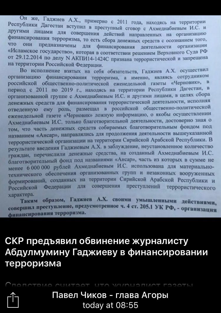 По версии следствия, являясь сотрудником газеты "Черновик", с 2011 по 2019 год Абдулмумин Гаджиев "размещал в еженедельнике ложную информацию о якобы осуществлении Ахмеднабиевым только благотворительной деятельности, достоверно зная, что часть денежных средств, собираемых фондом «Ансар», направлялись для продолжения террористической организации, действующей в Сирии", говорится постановлении, копию которого разместил сегодня в своем Telegram-канале глава международной правозащитной группы "Агора" Павел Чиков.