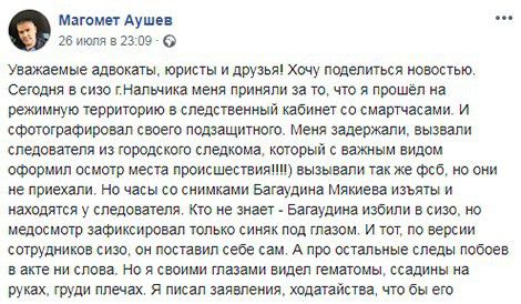 Адвокат задержанного ингушского активиста Багаудина Мякиева Магомет Аушев сообщил об инциденте в СИЗО Нальчика, где он фотографировал своего подзащитного с помощью смарт-часов. По словам Аушева, он хотел зафиксировать гематомы на теле Мякиева, но работники ФСИН изъяли смарт-часы, обвинив адвоката в нарушении закона.