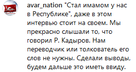 Значительно большее число комментаторов раскритиковали позицию главы Чечни. "Стал имамом у нас в республике", даже в этом интервью стоит на своем. Мы прекрасно слышали то, что говорил Р. Кадыров. Нам переводчик или толкователь его слов не нужны. Сделали выводы, будем дальше это иметь в виду", - написал, в частности, avar_nation.
