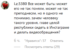 "Все может быть: может его не так поняли, может не так преподнесли, но я одного не понимаю, зачем человеку такого уровня, главе целой республики сидеть в Инстаграме и делать видеообращения", - написал пользователь i.z.5380. "Вот и я не понимаю", - согласился maria___flower.
