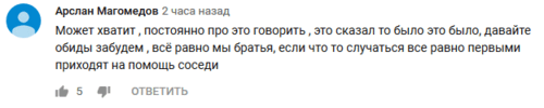 Схожие мнения высказали сегодня пользователи YouTube под видео с фрагментом интервью Рамзана Кадырова. "Может, хватит постоянно про это говорить, это сказал, то было, это было, давайте обиды забудем, всё равно мы братья, если что-то случается, все равно первыми приходят на помощь соседи", - написал, в частности, Арслан Магомедов.