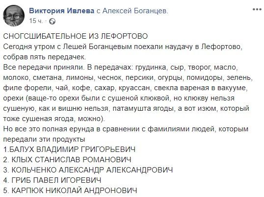 "Сегодня утром с Лешей Боганцевым поехали наудачу в Лефортово, собрав пять передачек. Все передачи приняли. В передачах: грудинка, сыр, творог, масло, молоко, сметана, лимоны, чеснок, персики, огурцы, помидоры, зелень, филе форели, чай, кофе, сахар, круассан, свекла вареная в вакууме, орехи (вообще-то, орехи были с сушеной клюквой, но клюкву нельзя сушеную, как и вишню нельзя, потому что ягоды, а вот изюм, который тоже сушеная ягода, можно)", - написала 20 августа на своей странице в социальной сети Facebook активистка Виктория Ивлева.
