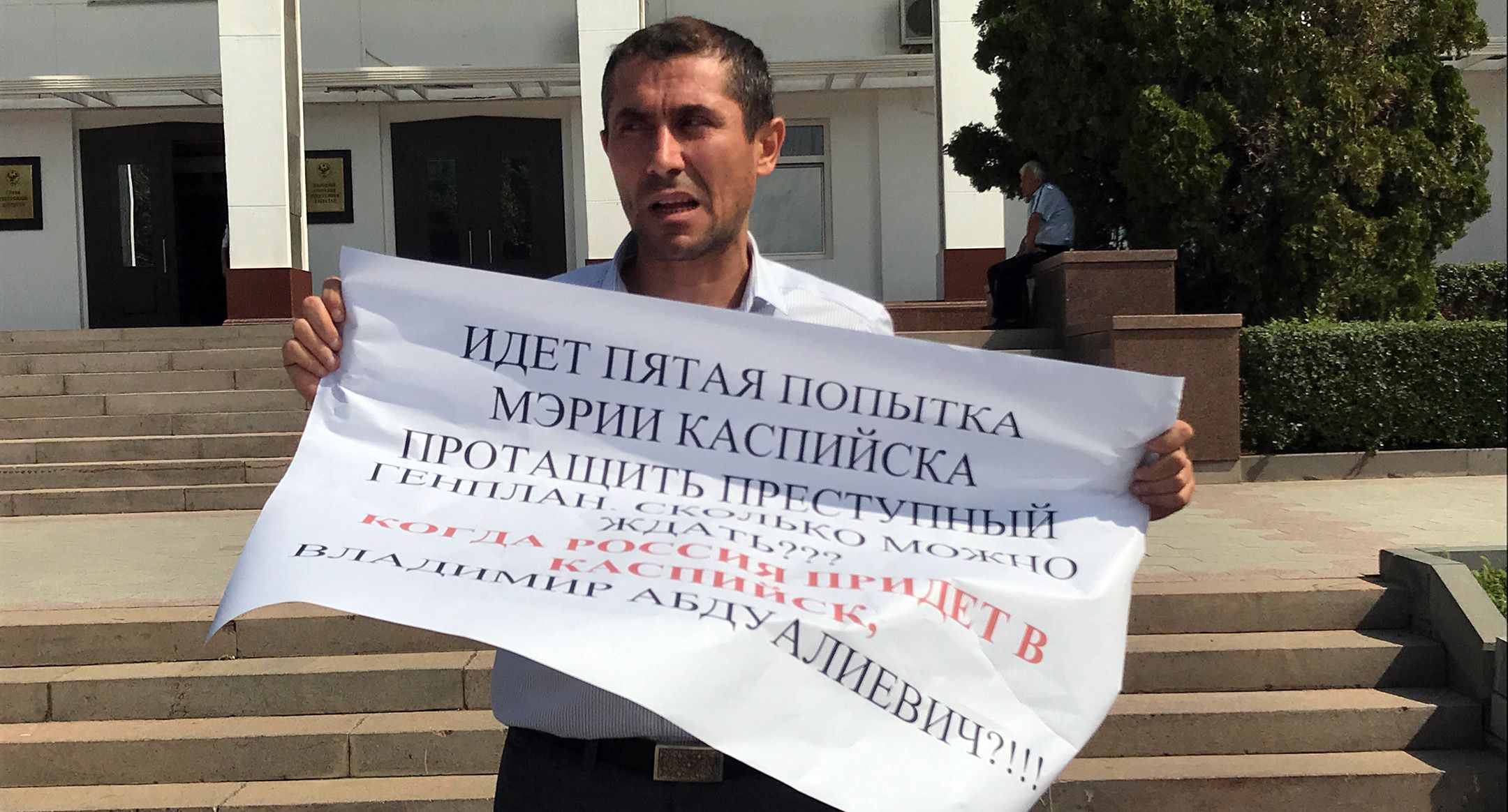 Как писал "Кавказский узел", 10 и 11 августа жители Каспийска на одиночных пикетах протестовали против принятия нового генплана, который, по их мнению, разрешит многоэтажную застройку набережной и центра города. Жители Каспийска поддержали борьбу активистов против застройки города.