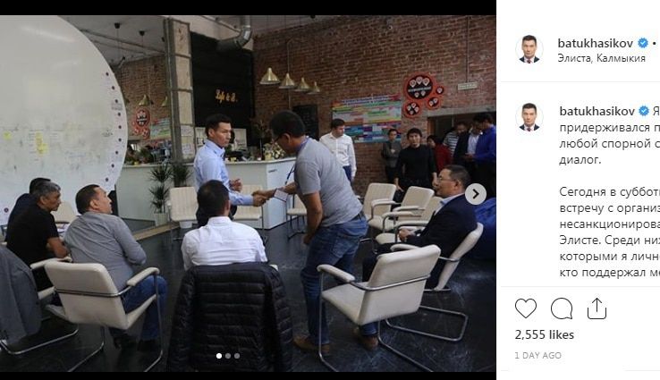 Скриншот со страницы batukhasikov в Instagram https://www.instagram.com/p/B3PpS0SgZkL/Комментируя встречу 5 октября, Бату Хасиков назвал противников назначения Трапезникова "организаторами несанкционированных митингов в Элисте".