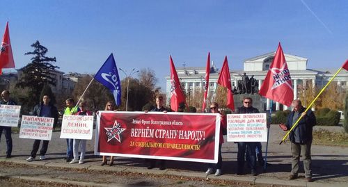Также днем 7 ноября на площади Металлургов в Волгограде прошел согласованный с властями пикет "Левого фронта". Акция продолжалась час. По данным организаторов, в ней приняли участие 11 человек. Активисты стояли с плакатами, на одном из которых была надпись: "Советская власть дала трудящимся пенсии, трудовой отпуск, декретный отпуск мамам, стипендии студентам. У вас еще не все это отняли?" - передает корреспондент "Кавказского узла".