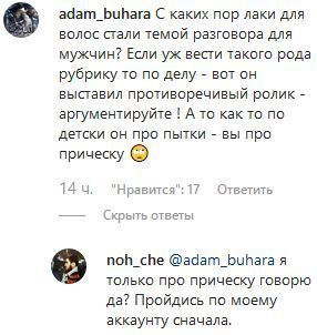 Пользователь с ником adam_buhara подверг критике формат дискуссии, выбранный Ахмадовым. "Если уж вести такого рода рубрику, то по делу - вот он выставил противоречивый ролик - аргументируйте! А то как-то по детски: он про пытки - вы про прическу", - написал пользователь.
