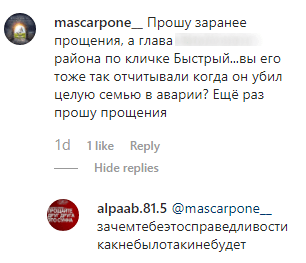 По состоянию на 23.48 мск 13 декабря публикация в этом чеченском паблике собрала 10,2 тысячи просмотров и восемь комментариев. "А глава <...> района по кличке Быстрый... Вы его тоже так отчитывали, когда он убил целую семью в аварии?" - написал комментатор под ником mascarpone__. "Зачем тебе это? Справедливости как не было, так и не будет", - ответил ему alpaab.81.5.