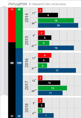 По числу вооруженных инцидентов в Ингушетии 2019 год сравнялся с предшествующим 2018 годом, когда было столько же вооруженных инцидентов. В 2018 году республике были убиты семь человек, еще двое получили ранения. Среди погибших пять боевиков и два гражданских лица, ранения получили два силовика, говорится в подготовленном "Кавказским узлом" статистическом материале. Красным в таблице о вооруженных инцидентах и жертвах в Ингушетии обозначены взрывы и теракты, черным - вооруженные инциденты, зеленым - раненые, синим - убитые.