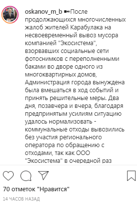 Ранее Осканов раскритиковал работу оператора по вывозу мусора в городе. На своей странице в Instagram 10 января он опубликовал фотографии свалки мусора вокруг контейнерной площадки. "В интернете появились фотоснимки мусорных баков, переполненных бытовыми отходами. Данная контейнерная площадка расположена на улице Осканова возле одного из многоквартирных домов. Налицо грубое нарушение компанией "Экосистема" взятых на себя обязательств", - написал он в комментарии к фото. Региональный оператор не обслуживает частный сектор, поэтому жителям приходится ставить мусорные пакеты на центральных улицах города, сообщил глава города. Он написал, что после жалоб горожан проведет анализ работы регионального оператора в Карабулаке.