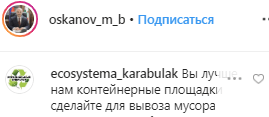 В свою очередь, компания "Экосистема" в комментарии под фото пожаловалась, что в городе не организованы площадки для сбора мусора. "Вы лучше нам контейнерные площадки сделайте для вывоза мусора, а там мы сами разберёмся", - говорится в сообщении с официальной страницы регоператора Instagram ecosystema_karabulak.