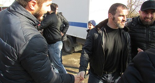 В 12.47 мск двери СИЗО распахнулись, и из приемной под приветственные возгласы односельчан вышли Элисхан Ажигов и Муса Плиев. В руках они держали сумки с вещами.