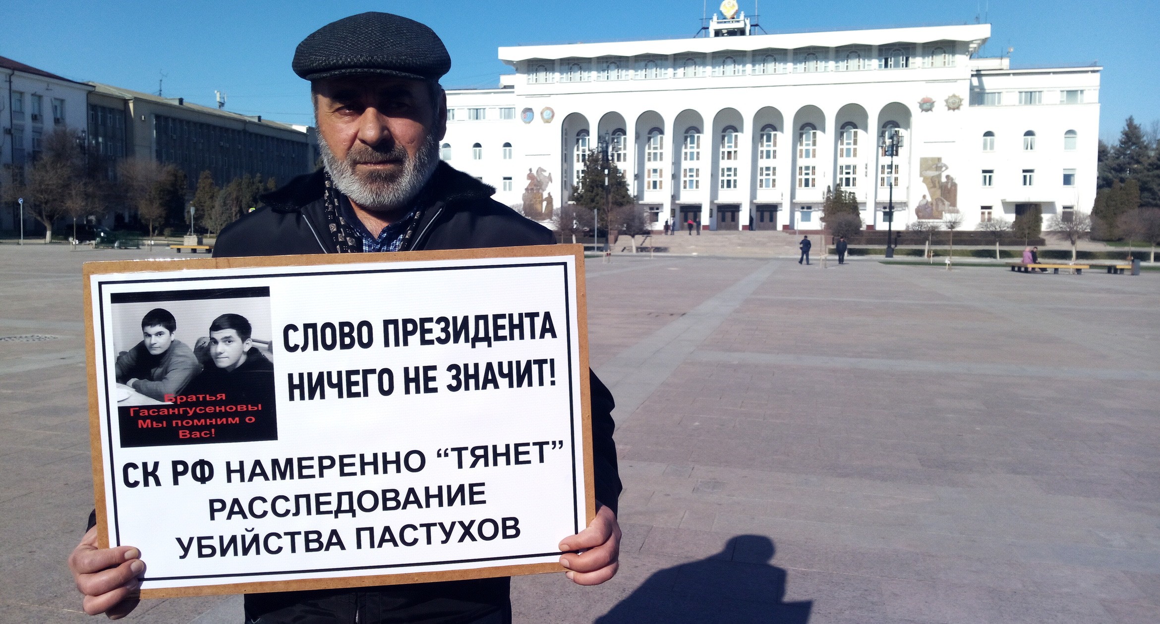 Отец убитых братьев-пастухов Муртазали Гасангусейнов провел 4 марта одиночный пикет на Центральной площади Махачкалы. Пикетирующий простоял около часа между зданиями мэрии города и Домом правительства с плакатом в руках, на котором было написано: "(Силовое ведомство) намеренно "тянет" расследование убийства пастухов" и "Слово президента ничего не значит!", сообщил корреспондент "Кавказского узла", побывавший на акции.