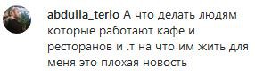 "Закрыть одни заведения и оставить другие, какой смысл? Рынок полностью закройте. Там самое большое скопление людей", - предложил laim___95. "А что делать людям, которые работают в кафе и ресторанах, на что им жить? Для меня это плохая новость", - написал abdulla_terlo.