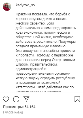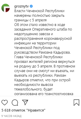 "Сегодня (1 апреля) принял решение с 5 апреля ввести режим полной изоляции Чеченской Республики от коронавируса. До этой даты все жители Чеченской Республики, находящиеся за пределами республики, должны вернуться домой", - написал Рамзан Кадров на cвоей странице в Instagram, насчитывающей 959 тысяч подписчиков.