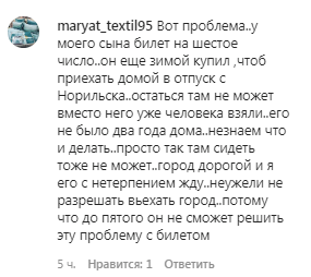 "У моего сына билет на шестое число... он еще зимой купил, чтоб приехать домой в отпуск с Норильска...  его не было два года дома", - пожаловалась maryat_textil95.
