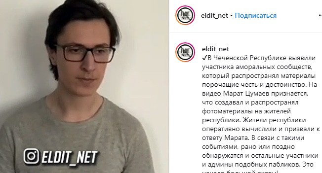 Как писал "Кавказский узел", пользователи Instagram отказались принять извинения жителя Чечни Марата Цумаева за оскорбительные публикации в Telegram. Молодого человека "вычислили и призвали к ответу" сами местные жители, подчеркнули администраторы чеченских пабликов.