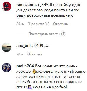 "Я не пойму одно, он делает это ради понта или же ради довольства Всевышнего?" – задался вопросом ramazanmkx_545. "Для инстаграма", - сыронизировала zarina01.02.19852020. "Всевышний знает, для чего он это делает", - вступила в дискуссию uma9785871. "Если делаешь, делай тихо, зачем на публику", - возразил ramazanmkx_545.
