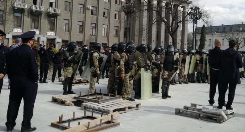 Силовики вызвали подкрепление на площадь во Владикавказе, где проходит стихийная акция протеста против режима самоизоляции. Протестующие начали бросать в силовиков камни и бутылки.