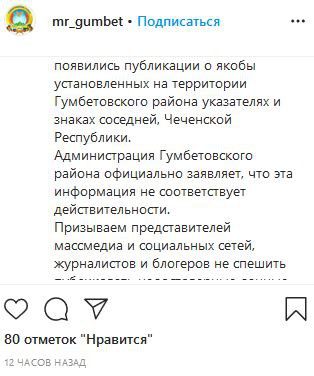 Где и когда была опубликована такая информация, в сообщении не уточняется. 2 июня РИА "Дербент" сообщило, что на границе Гумбетовского района Дагестана и Чечни появились пограничные таблички с надписью "Чеченская Республика". "По предварительной информации, территориальные знаки были установлены на территории Дагестана, а не Чечни. Источники РИА "Дербент" из Гумбетовского района подтвердили информацию о действиях чеченской стороны", - говорится в публикации.