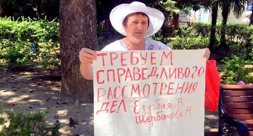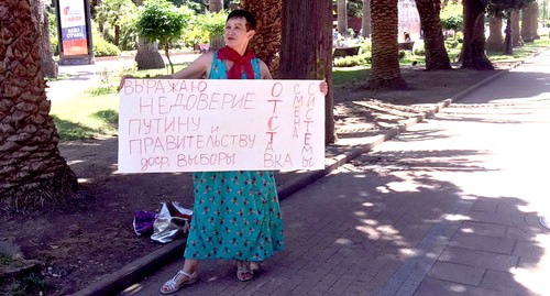 Она вышла на Площадь флага около мэрии Сочи с плакатами: "Выражаю недоверие Путину и правительству", "Нет узурпатору!" и "Не дай себя обмануть". Кроме того, еще на одном плакате она написала требование справедливо рассмотреть дела Вахтанга Езугбаи и Николая Щербакова.